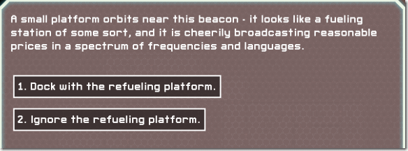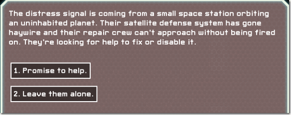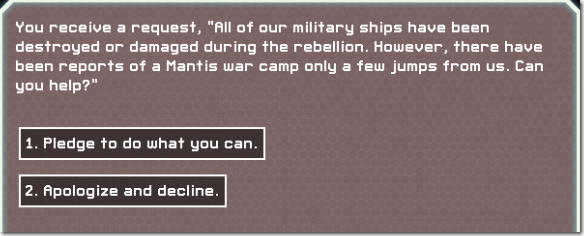 1を選んで頼みを聞くと、反乱軍に襲われている宇宙港(ショップ)を助けに行くか、海賊になった仲間を懲らしめるかになる。 どちらも戦闘が起こる。