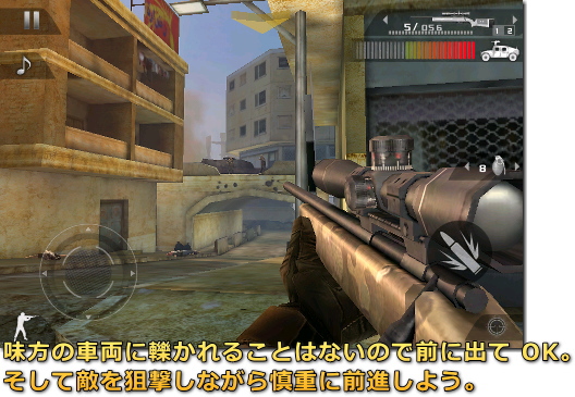 バリケードを破壊後、周辺の敵兵に車両を狙う者がいるので、これも狙撃して倒しておこう。 車両が通過して見えなくなったらひとまず安心だ。