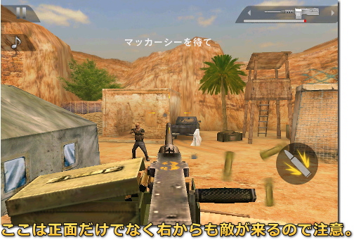 ここはバリケードの破壊も重要だが、周囲からプレイヤーを狙う敵兵も出てきて、さらにバリケードとは反対側からも敵が出現し車両やプレイヤーを狙ってくる。