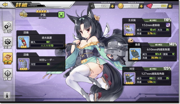 ※装備画面。このキャラはオーソドックスな軽巡で主砲+魚雷型。